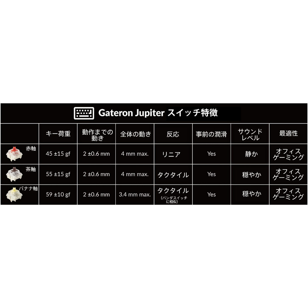 Keychron独自のGateron Jupiterメカニカルスイッチは3ピン設計で、最大8000万キーストロークの寿命を持ち、信頼性の高いGateron品質基準で潤滑済みです。ユニークなLEDディフューザーデザインは、高いRGBバックライト透過率とソフトなバックライト効果を提供します。 バナナスイッチは、パンダスイッチのようなスムーズな操作感を提供します。