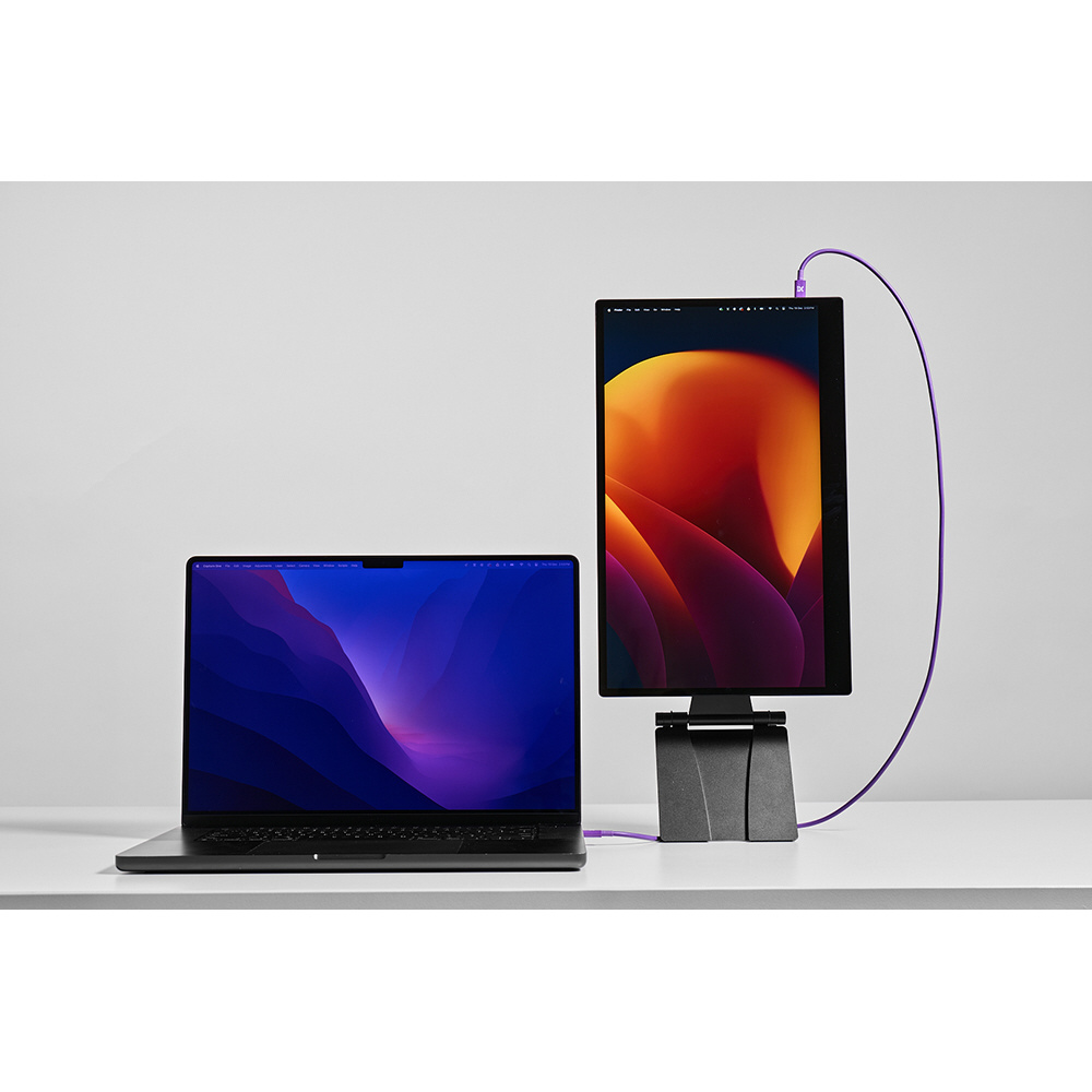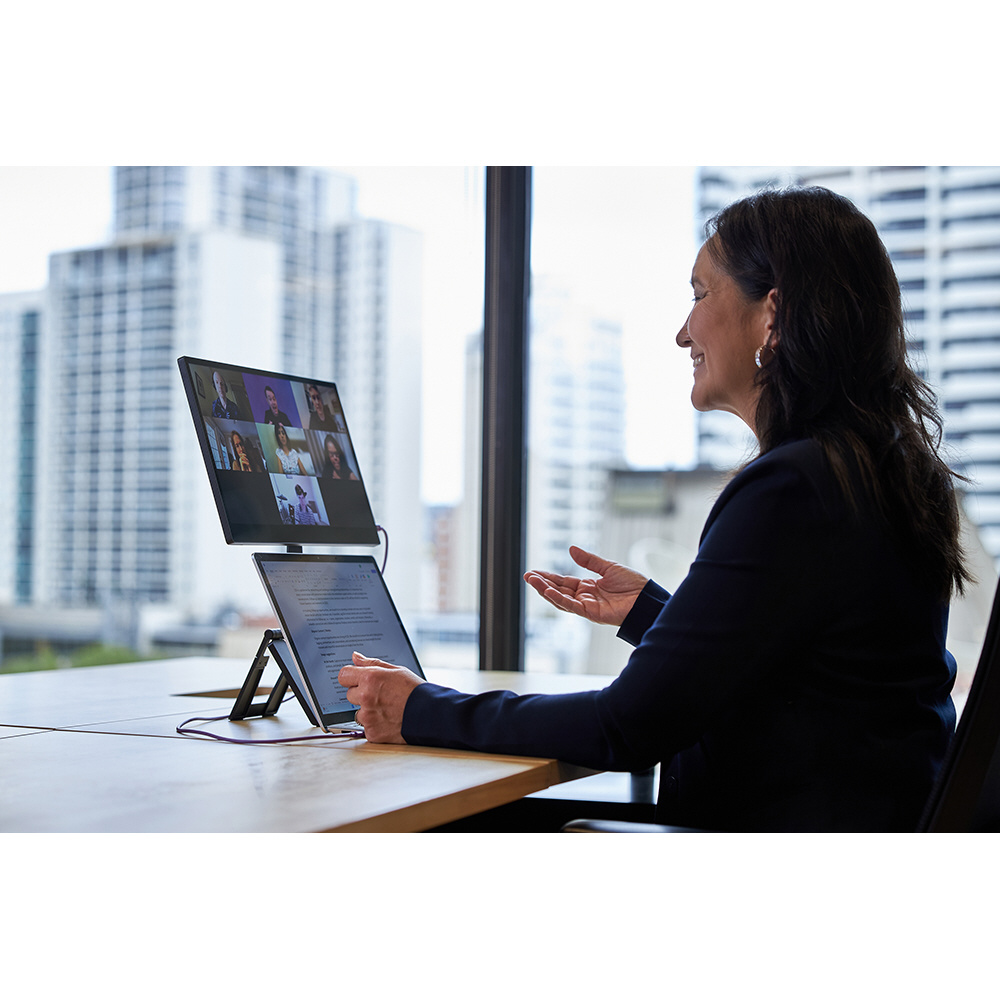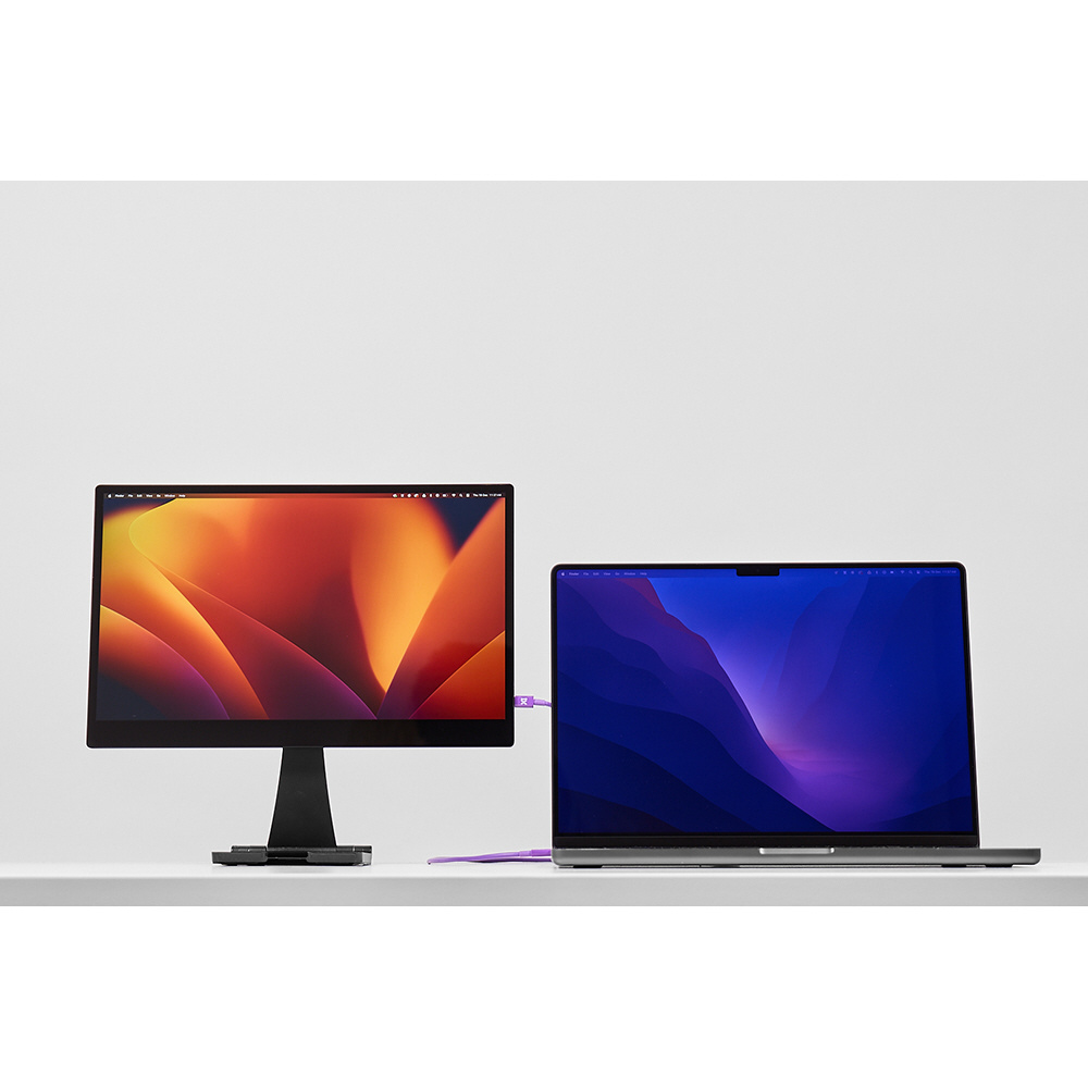 ディスプレイ本体は厚さ約9mm、重量約800gと、非常に薄く軽量な設計を採用。バックパックやブリーフケースにすっきり収まり、移動の多いビジネスシーンでも負担になりません。航空宇宙グレードのアルミニウムと強化ガラスを組み合わせることで、持ち運びに適した耐久性と、シンプルで上質なデザインを両立しています。