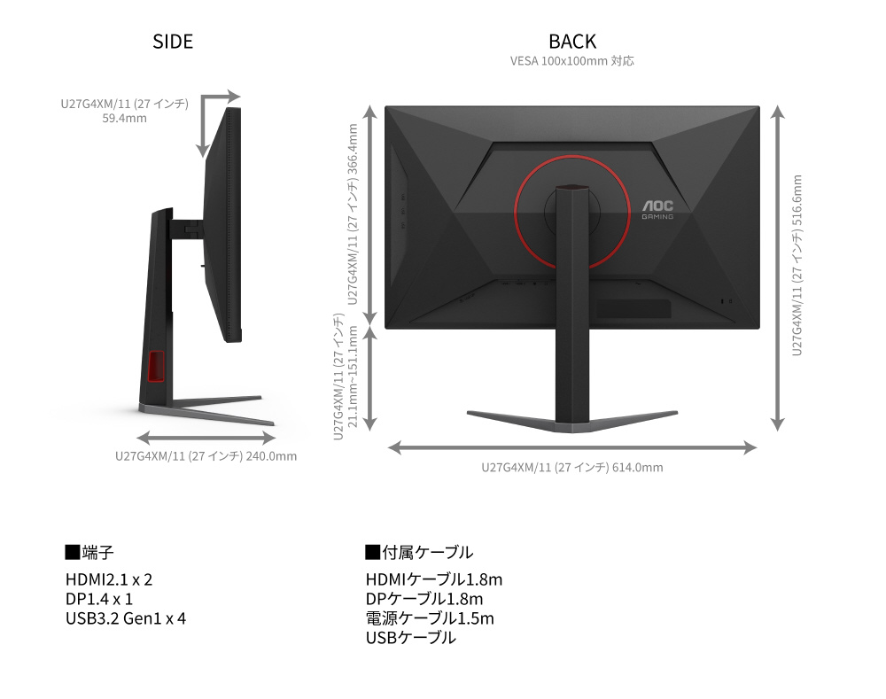 付属品 電源ケーブル1.5m、HDMIケーブル1.8m、Displayportケーブル1.8m、USBアップストリームケーブル1.5m、スタンド、ベース、保証書、ケーブル付属リスト