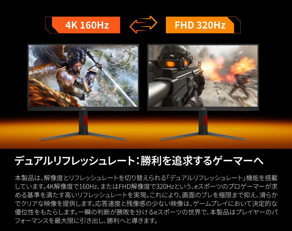 垂直走査周波数(Hz) デュアルリフレッシュレート:4K/160Hz、FHD/320Hz