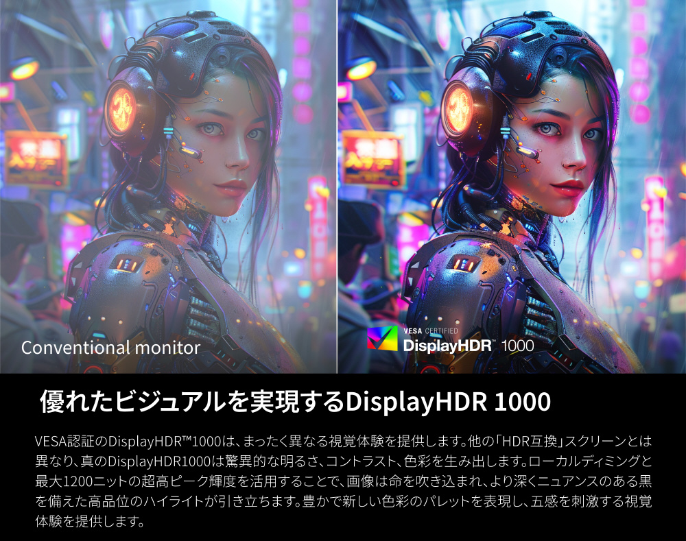 VESA認証のDisplayHDR 1000により、最大1200ニットの輝度とローカルディミングで深みのある黒と鮮明なハイライトを実現。