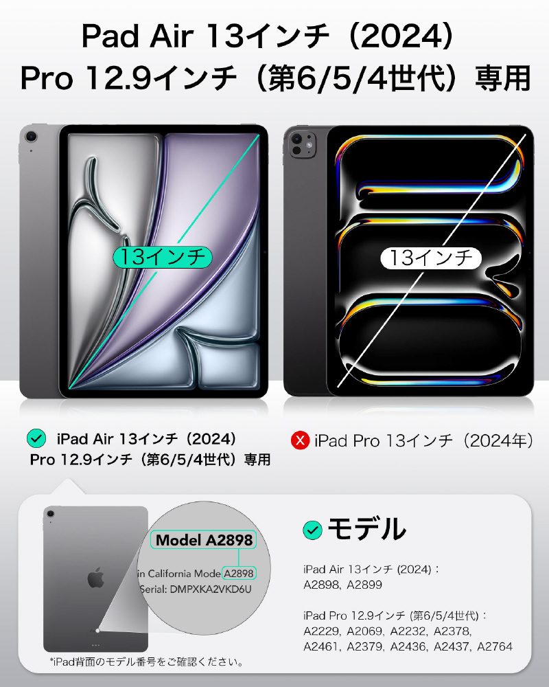 iPad Air 13インチ M4/M3/M2(2026/2025/2024)およびiPad Pro 12.9インチ(第6/5/4世代、2022/2021/2020)専用です。モデル: A2898、A2899、A2378、A2461、A2379、A2462、A2229、A2069、A2232、A2233、A1876、A2014、A1895、A1983。他のiPadモデルと互換性がありません。