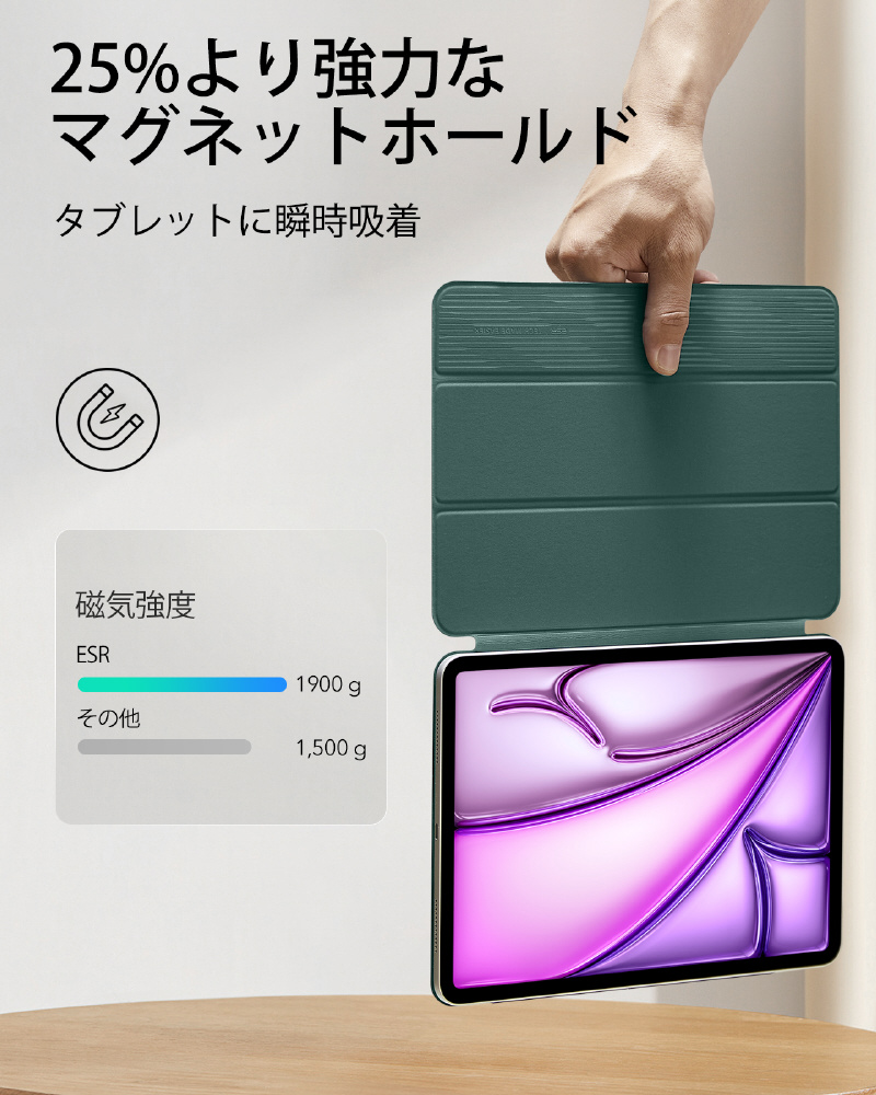 13インチiPad Air(M4/M3/M2)、12.9インチ iPad Pro(第6/5/4世代)用 マグネットケース 三つ折りスタンド ESR Rebound Magnetic iPad Air 13 M2 フォレストグリーン