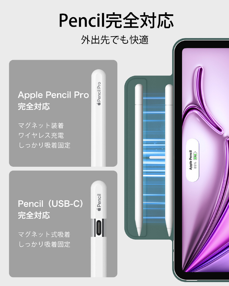Pencil Proへ完全対応かつ、磁気充電用の側面の溝と、Pencilをしっかりと固定するマグネットクラスプを備えています。