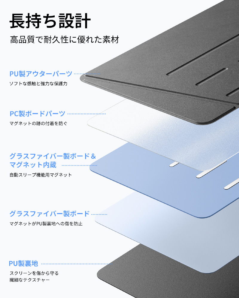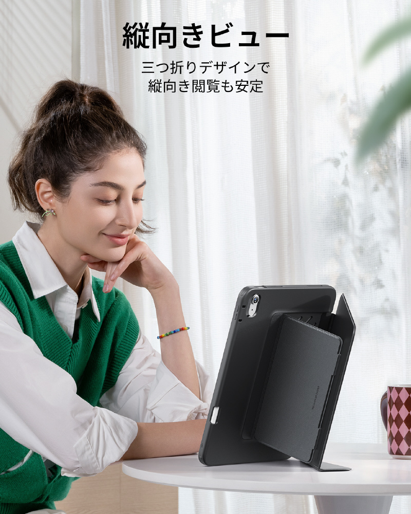 3段階調節可能な横向きモードと、独自開発の「三角ダブルロック構造」を採用した縦向きモードを備えています。動画視聴からSNS閲覧まで、磁石スタンドサポートによる固定デザインにより、確かな安定性を実現します。縦向き利用時は2番目のマグネット位置へ固定し、フロントカバーの小さな三角パーツを外側に折ることでしっかりと自立します(内側に広げて使用しないでください)。