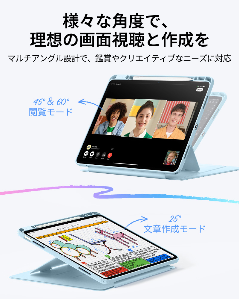 2つのスタンドモードに対応しており、45°〜60°はビデオ鑑賞、作業、FaceTimingなどに最適なビューイングモードへと、25°に調節した場合は執筆、絵画、その他のクリエイティブな作業に最適なライティングモードへと用途に合わせて角度調節が行えます