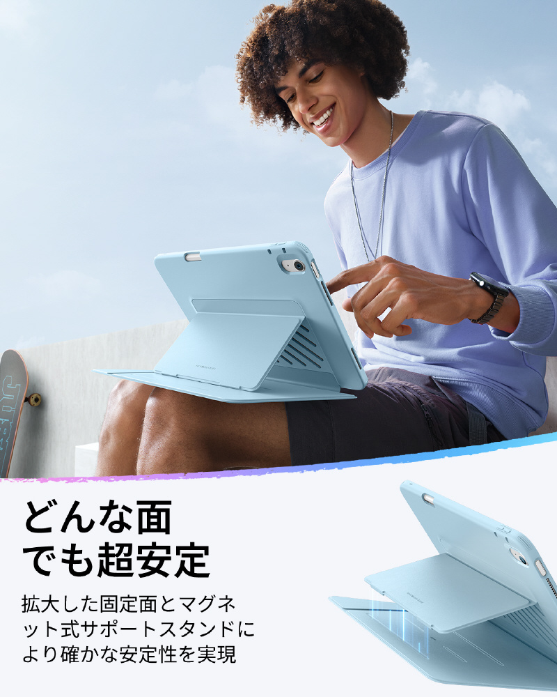 3段階調節可能な横向きモードと、独自開発の「三角ダブルロック構造」を採用した縦向きモードを備えています。動画視聴からSNS閲覧まで、磁石スタンドサポートによる固定デザインにより、確かな安定性を実現します。縦向き利用時は2番目のマグネット位置へ固定し、フロントカバーの小さな三角パーツを外側に折ることでしっかりと自立します(内側に広げて使用しないでください)。