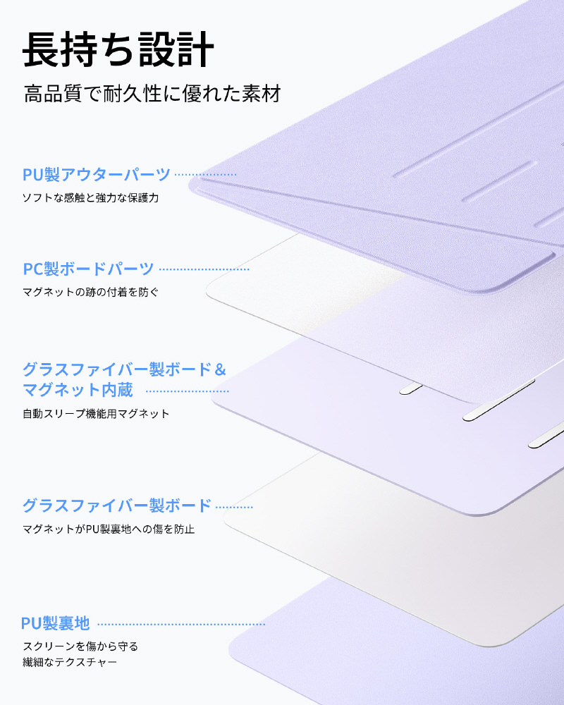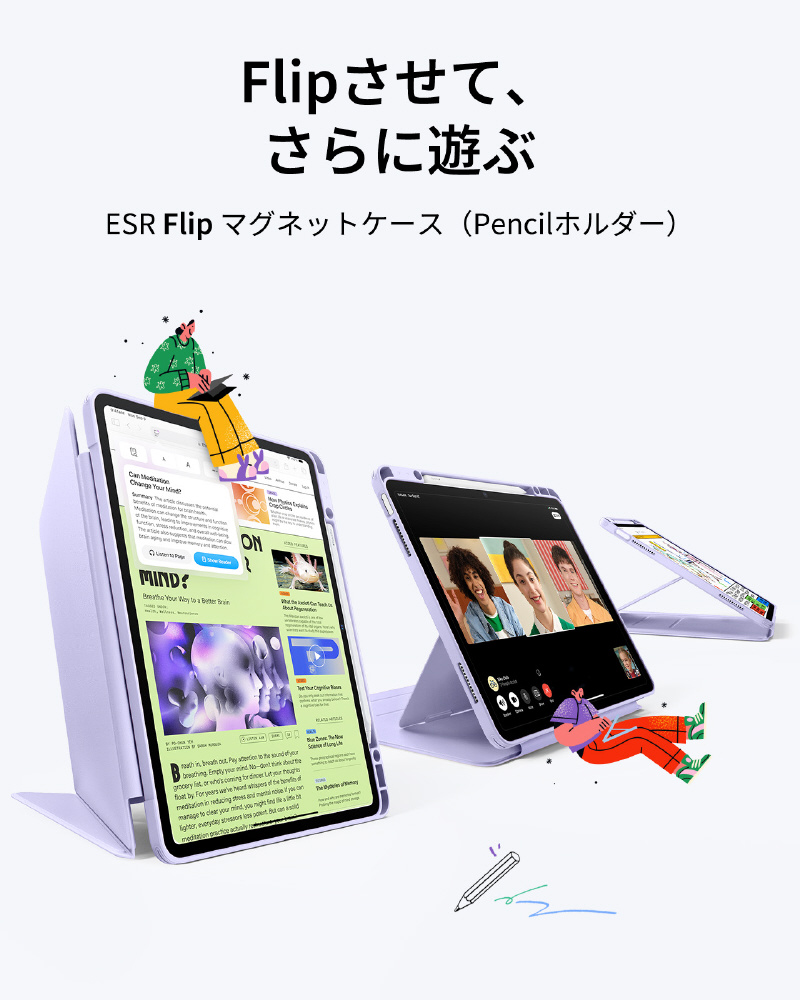 3段階調節可能な横向きモードと、独自開発の「三角ダブルロック構造」を採用した縦向きモードを備えています。動画視聴からSNS閲覧まで、磁石スタンドサポートによる固定デザインにより、確かな安定性を実現します。縦向き利用時は2番目のマグネット位置へ固定し、フロントカバーの小さな三角パーツを外側に折ることでしっかりと自立します(内側に広げて使用しないでください)。