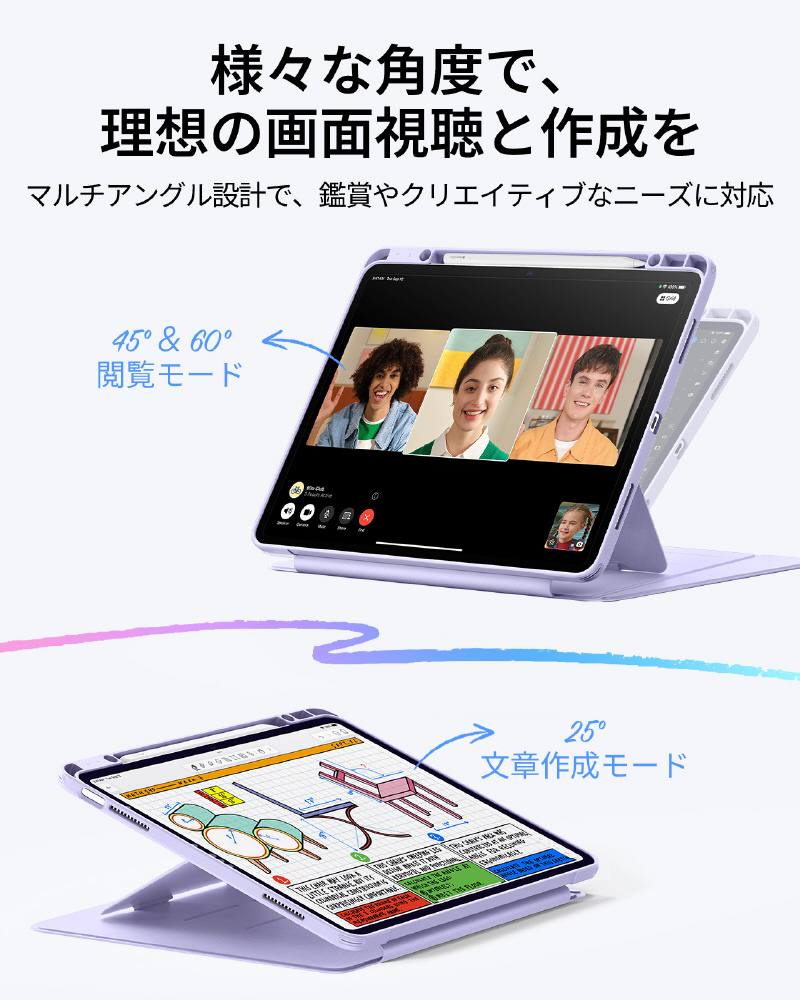 2つのスタンドモードに対応しており、45°〜60°はビデオ鑑賞、作業、FaceTimingなどに最適なビューイングモードへと、25°に調節した場合は執筆、絵画、その他のクリエイティブな作業に最適なライティングモードへと用途に合わせて角度調節が行えます