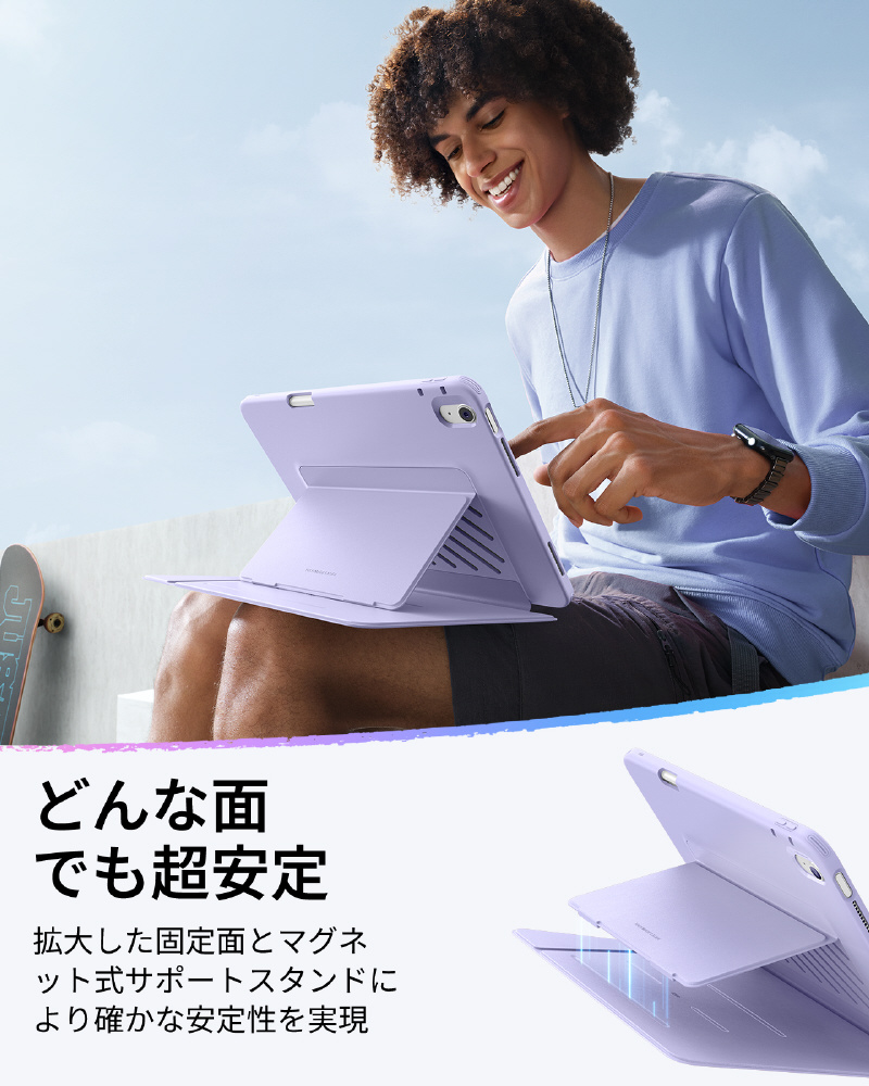 幅広いカバーと強力なマグネットブラケットで設計された当ケースは、ソファ、ベッド、手、膝の上など、どのような表面でも安定し、滑ることなく安定性を保ちます