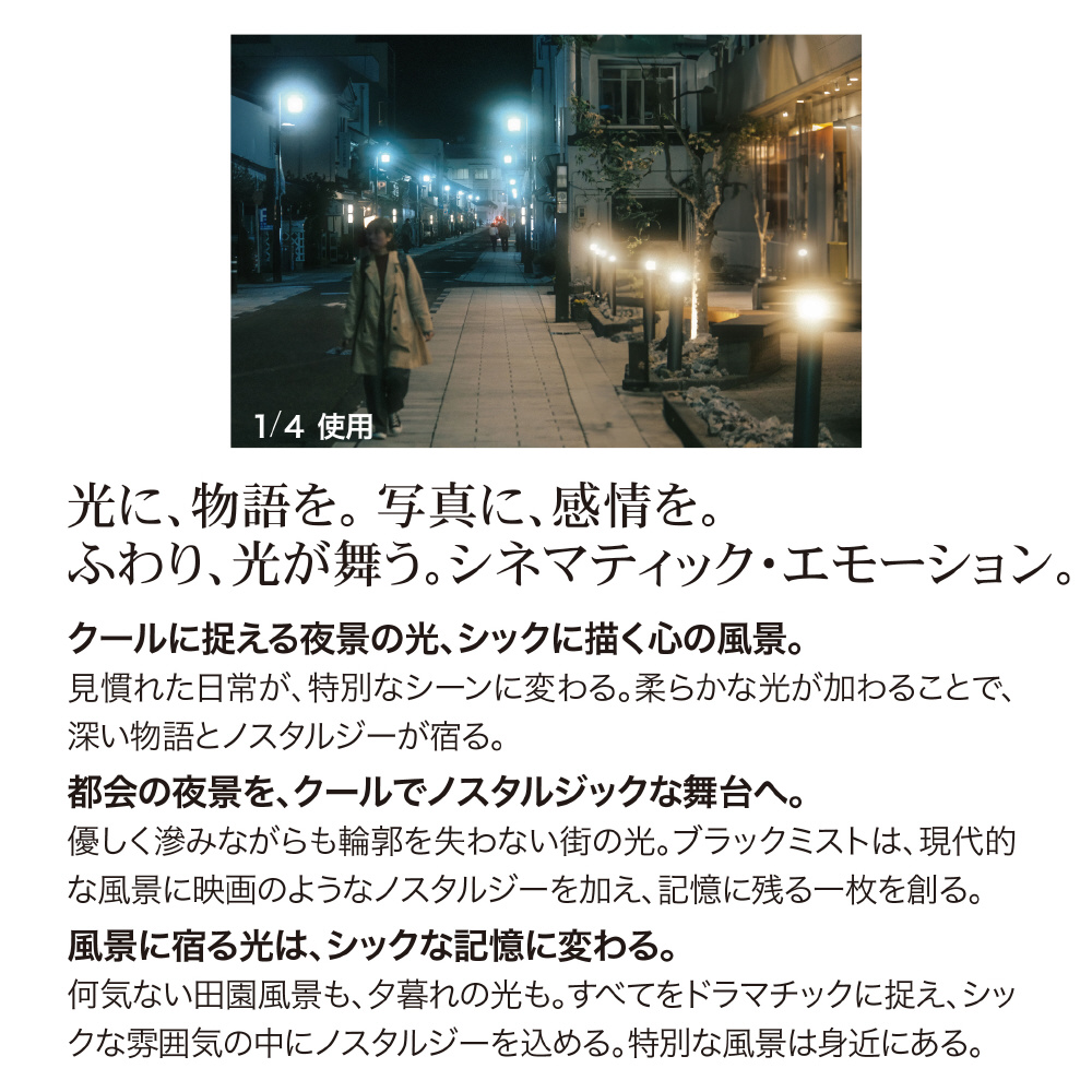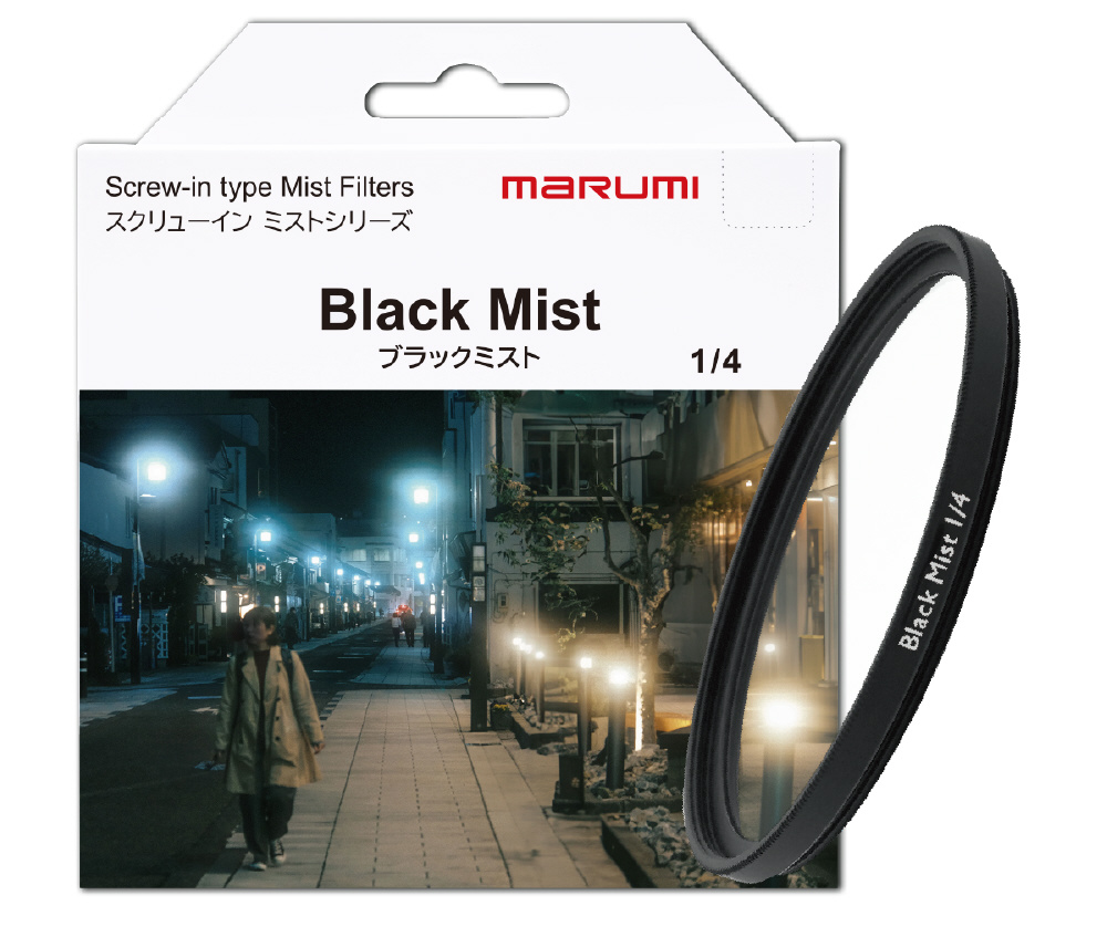 ガラスの内面に微細な黒い拡散材を施したフィルターで、映画やドラマの世界でも広く活用されている、人気の高いフィルターです。ハイライトを柔らかく拡散させながらも、コントラストや黒の締まりは維持するため、クールでシネマティック、あるいはノスタルジックな雰囲気を演出します。拡散効果の強さの違う、1/8、1/4、1/2の3種類の濃度をご用意しました。