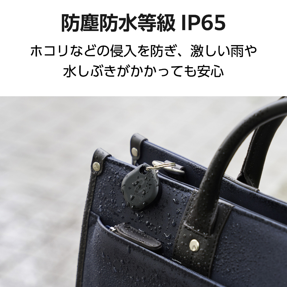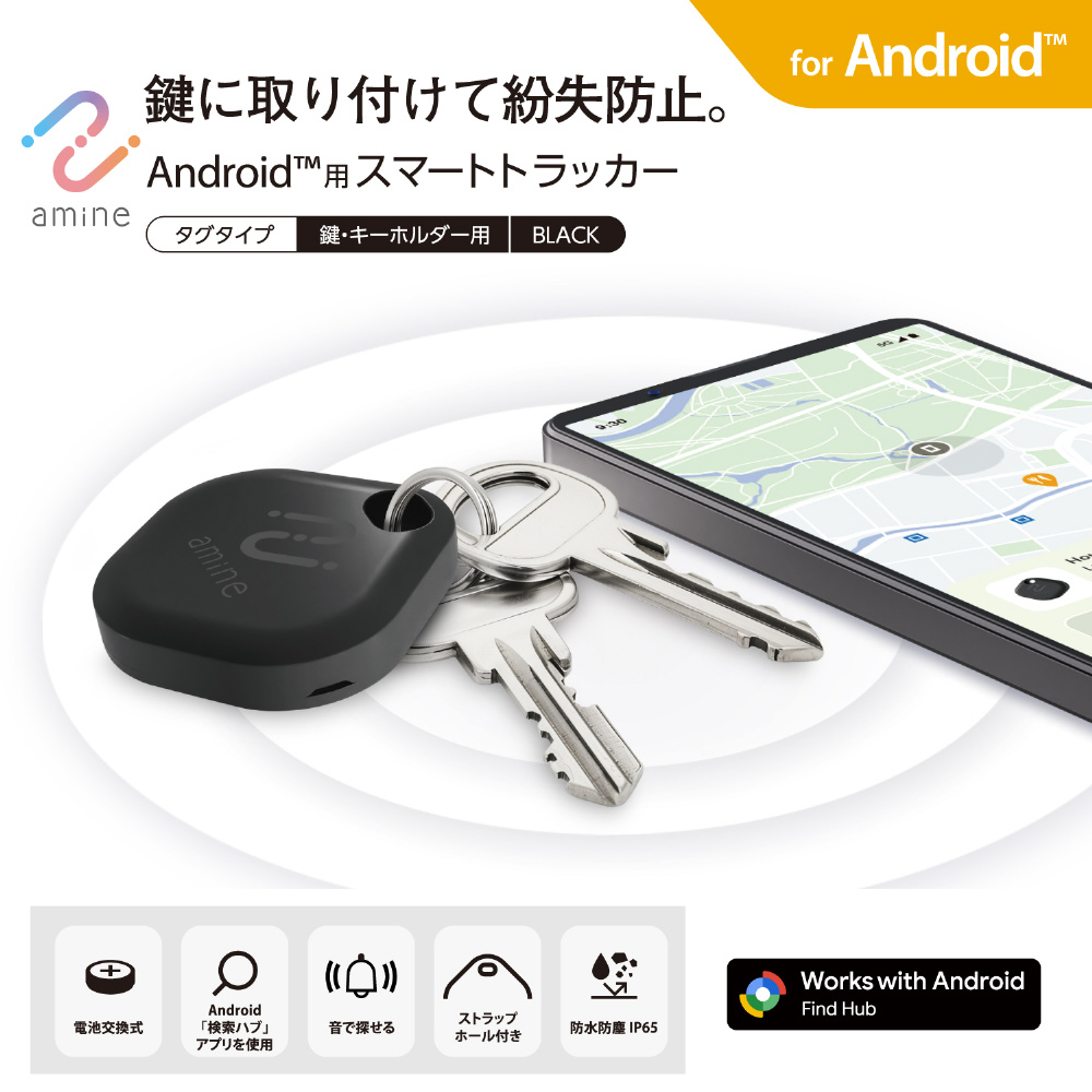 Android(TM)の「Find Hub」アプリから位置を確認!鍵や財布、かばんなど大切な荷物に付けて位置情報を追跡できるamine(あみね)シリーズの忘れ物防止タグです。激しい雨に濡れても安心の防水・防塵等級IP65だから、多彩なシーンで活躍。重さはたったの8.2gだからキーホルダー感覚で付けられます。