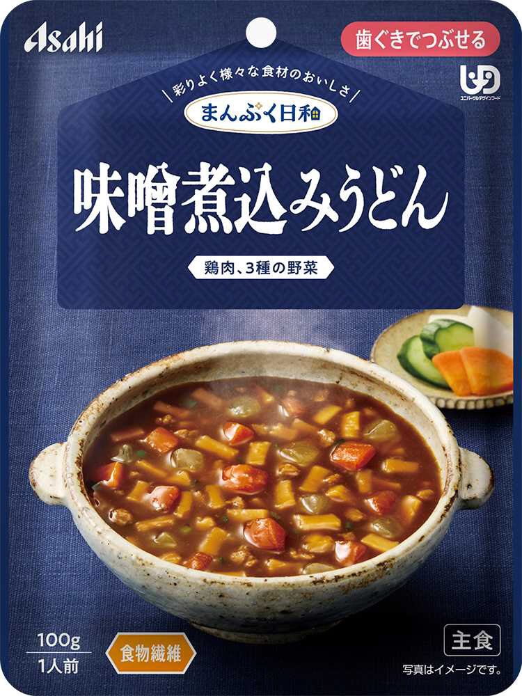 ・数種類の食材のうま味や香り、だしやエキスの風味を生かした、風味豊かな味わい。・食べづらくなった食材も、じっくり煮込んで食べやすいやわらかさや大きさ。・食物繊維配合。・鶏肉、にんじん、だいこん、青ねぎ、食べやすい長さのうどんを、2種類の味噌で、コクのある味わいにやわらかく煮込みました。・故郷や旅行の思い出を想起させるご当地メニューです。・紺色の背景に、普段の食事らしいシズル感が映えるパッケージデザイン。・真っすぐ切れるミシン目入りレトルトパウチ