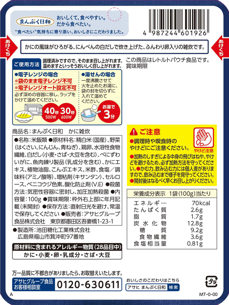・数種類の食材のうま味や香り、だしやエキスの風味を生かした、風味豊かな味わい。・食べづらくなった食材も、じっくり煮込んで食べやすいやわらかさや大きさ。・食物繊維配合・紅ずわいがに、かまぼこ、はくさい、にんじん、青ねぎ、たまご入り。・かにの風味がひろがる、にんべんの「白だし」で炊き上げた、ふんわり卵入りの雑炊です。・紺色の背景に、普段の食事らしいシズル感が映えるパッケージデザイン・真っすぐ切れるミシン目入りレトルトパウチ