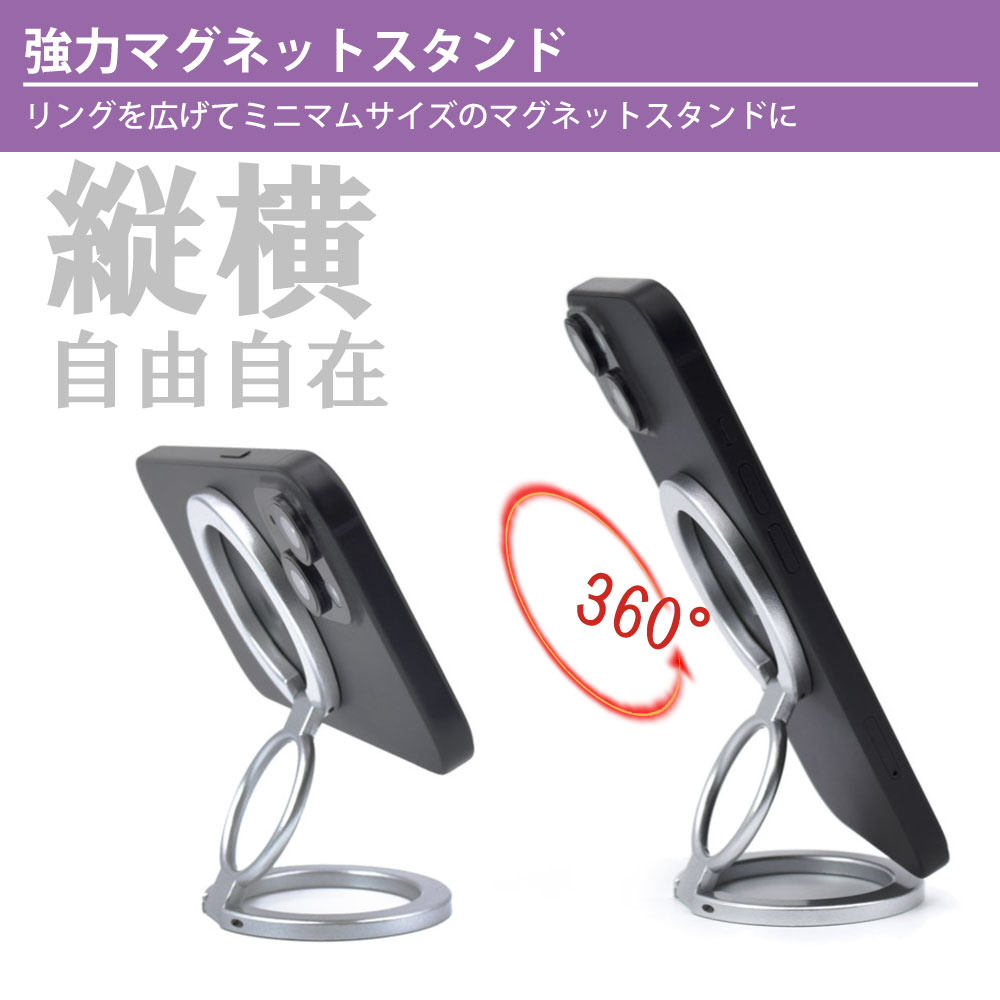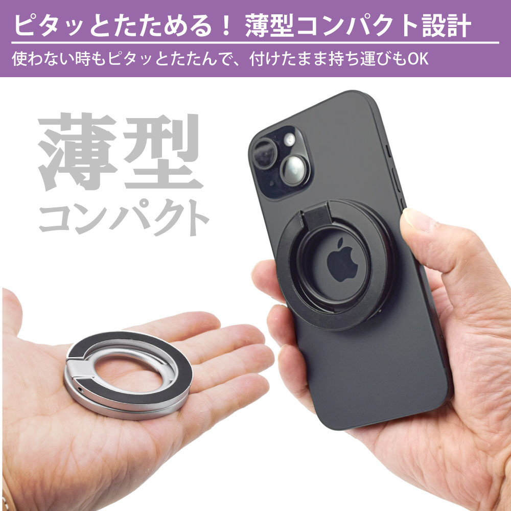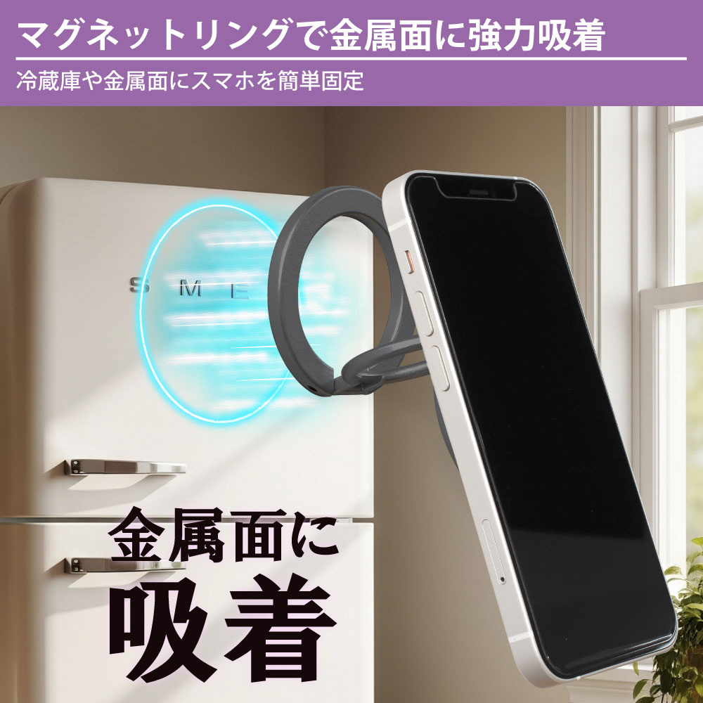 2つのマグネットリングを搭載したスマホ用アクセサリーで、金属面への強力な吸着と自由な角度調整を実現。スマホリングとしての落下防止機能やスタンドとしての使用も可能で、動画視聴や通話、料理中のレシピ確認など、日常の様々なシーンで活躍します。薄型設計で持ち運びにも便利です。