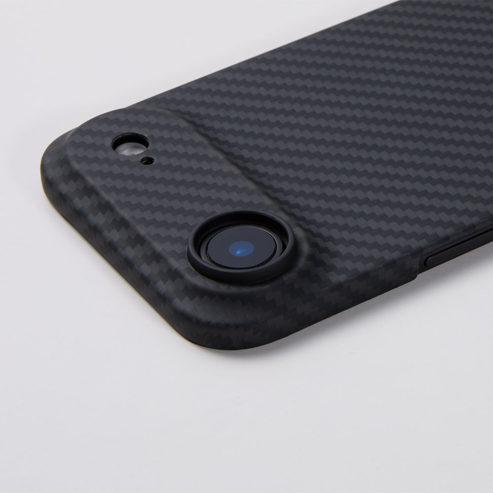 カメラ開口部を本体になじむ特殊仕様としていますので、ケースから露出する本体部を出来るだけ少なくし、アラミド繊維が覆うように配慮しています。