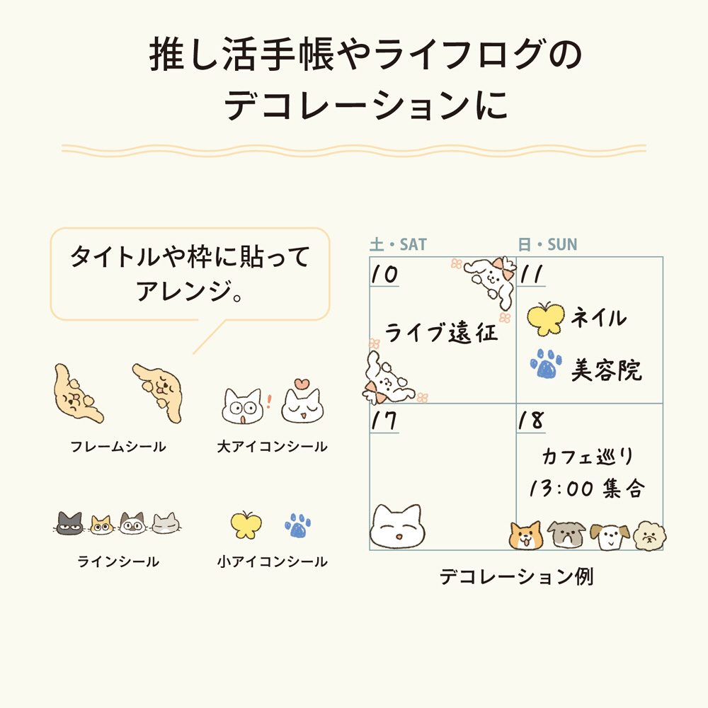 推し活をより楽しく!ライフログにぴったりなマスキングテープ素材のシールができました。5名のクリエイターとコラボレーションしたマスキングテープ素材のシールで、推し活やライフログノートのデコレーションにおすすめです!フリーマンスリーやタイトルに貼ってアレンジできるフレームシールや、推し活をしている様子を再現できるシチュエーションシール等が入っています。