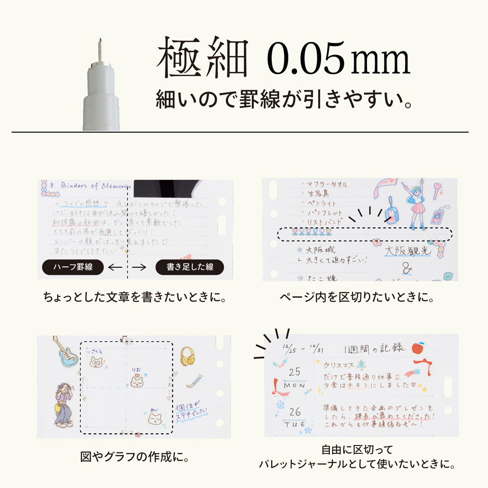 罫線を書き足す極細ペンが登場!罫線の色に合わせた淡いカラーのペンで、罫線を書き足すことができます。線幅0.05mmの極細ペン先で細い罫線が引けます。耐水性がある水性顔料インクで上からマーカーで色を塗っても滲みにくいライフログにぴったりなペンです。