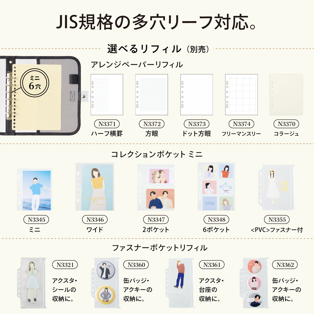 JIS 規格の多穴リーフもとじられるミニ 6 穴とじ具を採用。