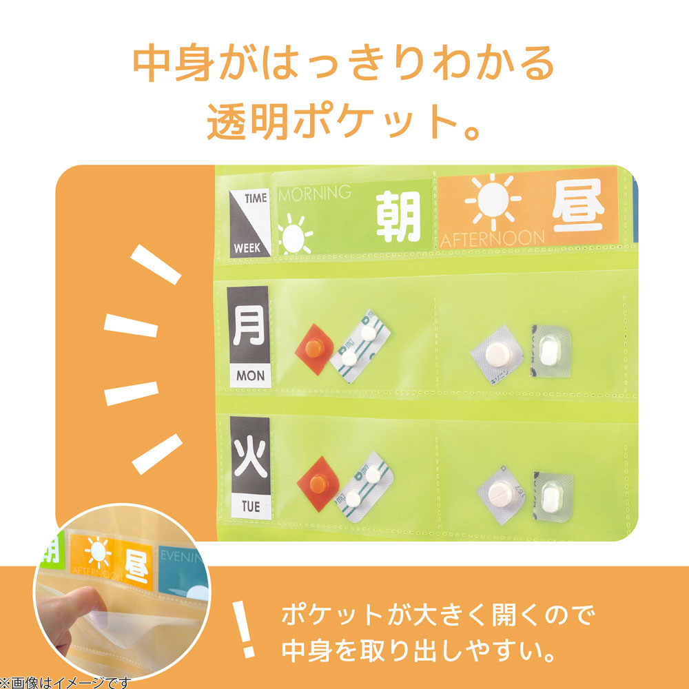 月曜日〜日曜日までの 1 週間のおくすりを管理でき、 1 日を朝・昼・夕・ねる前の 4 区分にわけて管理ができます。ポケットは透明で中のおくすりがはっきりわかり、飲み忘れを防止します。