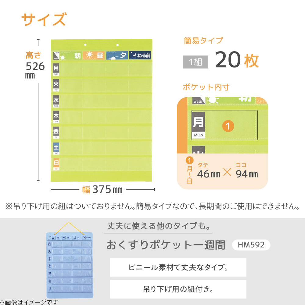 リーズナブルな簡易タイプのおくすりポケット1週間がリニューアルして新登場!1日4回(朝・昼・夕・ねる前)×1週間分の薬が入るポケットで、飲み忘れを防止します。ポケットの横幅が大きくなり、薬がより取り出しやすくなりました!もしもの時の連絡先や健康情報を書き込める緊急連絡カードと、連絡先見出しカードが付いてます。最下段には緊急連絡カード、調剤薬局や医療機関の名刺等が入れられるポケットが付いております。