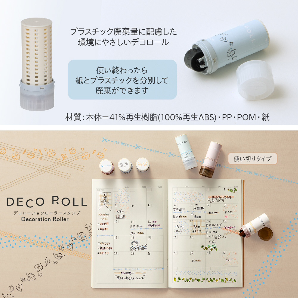 「デコロール」は、コンパクトなスティック形状のローラー式スタンプ。コロコロと転がすだけで、手帳や日記、ノート、カードなどを淡いカラーのインクで好みの長さに飾って楽しめる、新しいタイプのデコレーションツールです。上から色塗りしてもにじみにくい。ローラーは視認性が高く、引き始めを狙いやすい。柔らかい印面を使用しているので、捺印対象にフィットして失敗しにくい。コンパクトなので、握りやすく、捺印しやすい。机の上でも場所を取らない。ぬくもりを感じる紙ならではの質感。