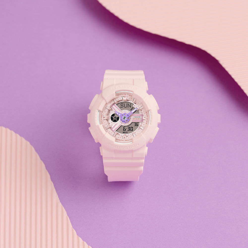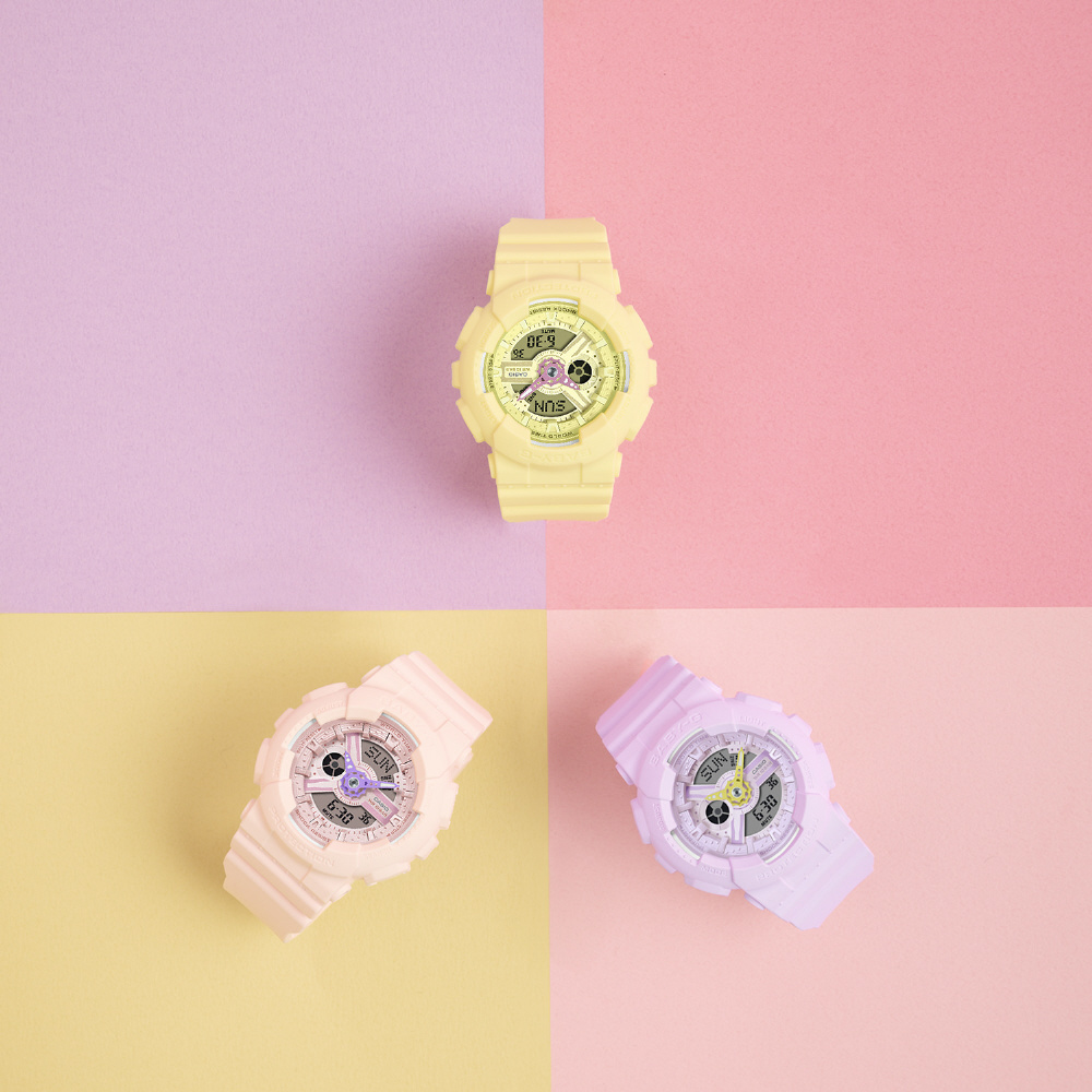 アクティブな女性に向けた耐衝撃・カジュアルウオッチBABY-Gから、柔らかなソフトカラーを纏ったデザインで、日常に彩りを添えるモデルです。