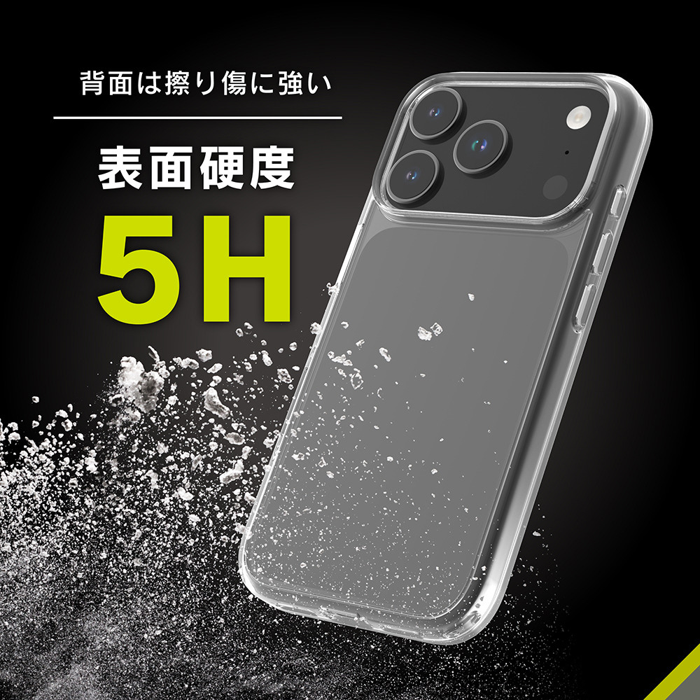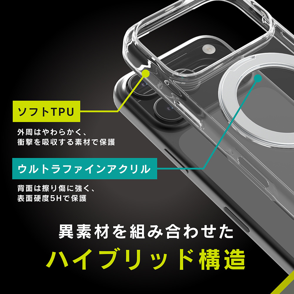 背面を超硬質素材、側面をやわらか素材で守るハイブリッド構造クリアケース。