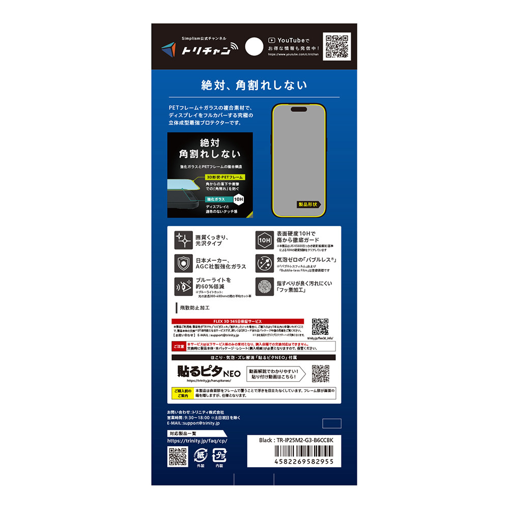 iPhone 17 / 16 Pro フィルム [FLEX 3D] 60%ブルーライト低減 複合フレームガラス ブラック TR-IP25M2-G3-B6CCBK