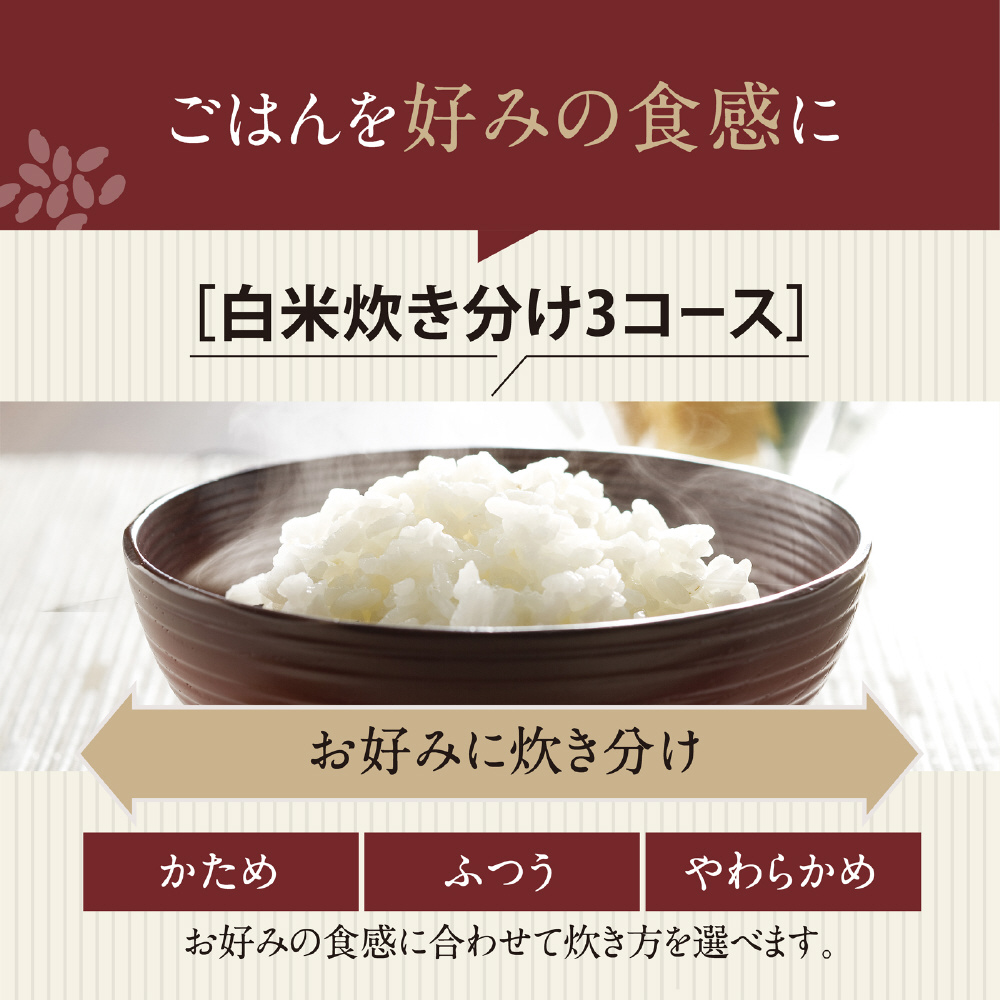 ・ご家庭のお好みに合わせ、ふつう・やわらかめ・かためと炊き方が選べます。
