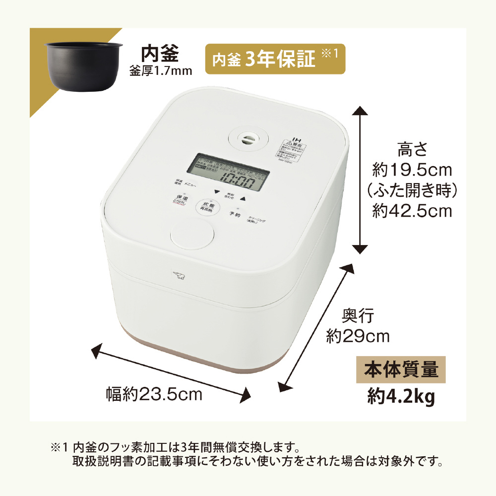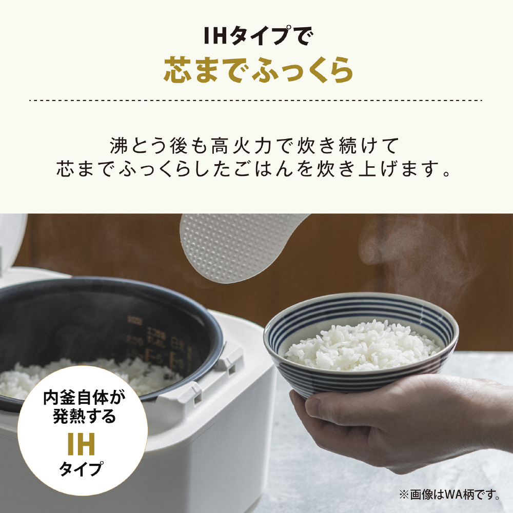 ・ふきこぼれを気にせず、沸とう後も火を引かずにIHの高火力で炊き続けます。うまみを引き出し、芯までふっくらしたごはんが炊き上がります。