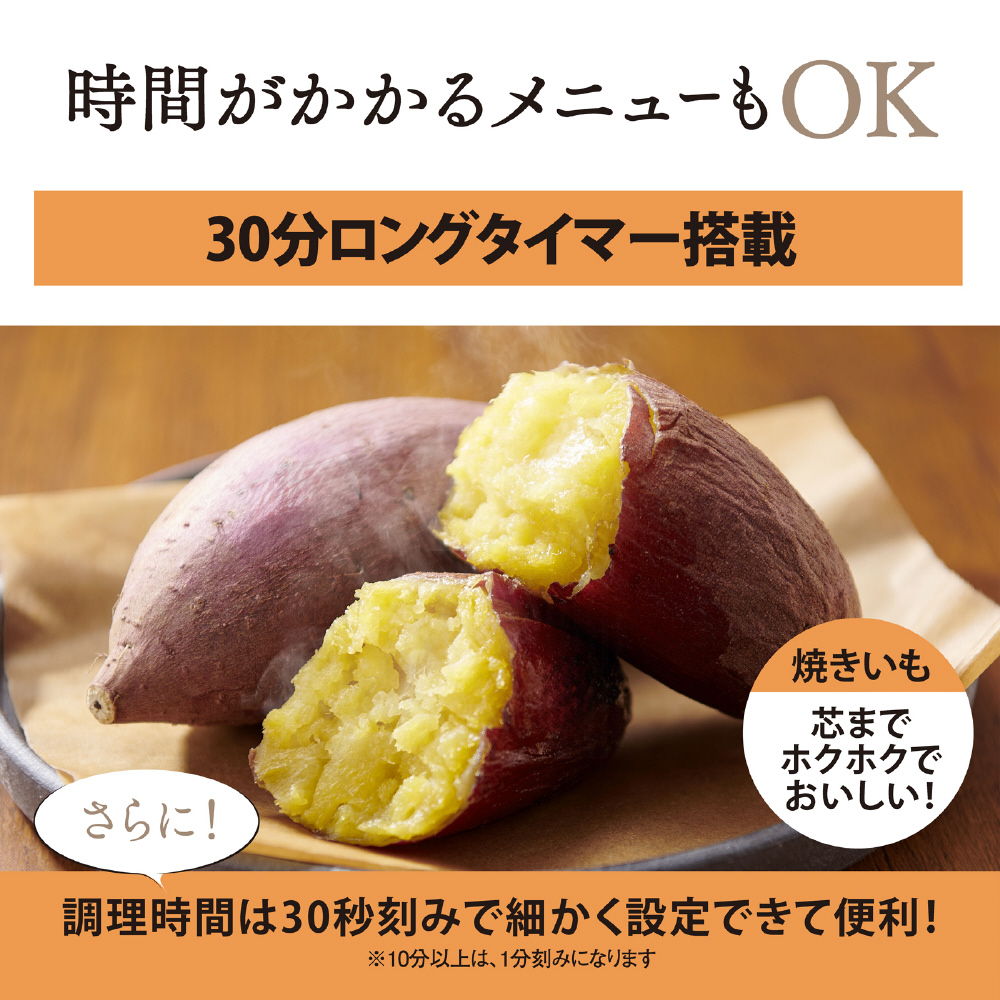 ・減算式のデジタル表示で、30秒刻みで設定できます。調理時間が長い、焼きいもにも対応。