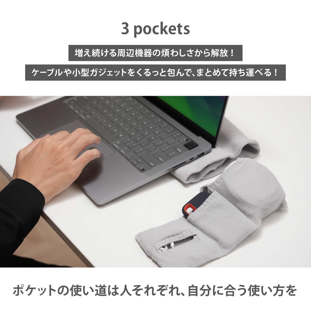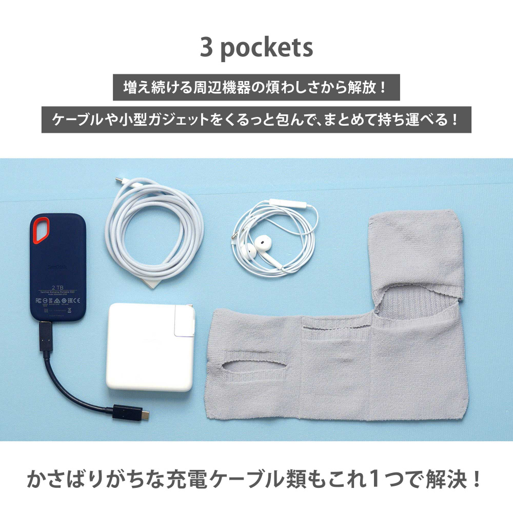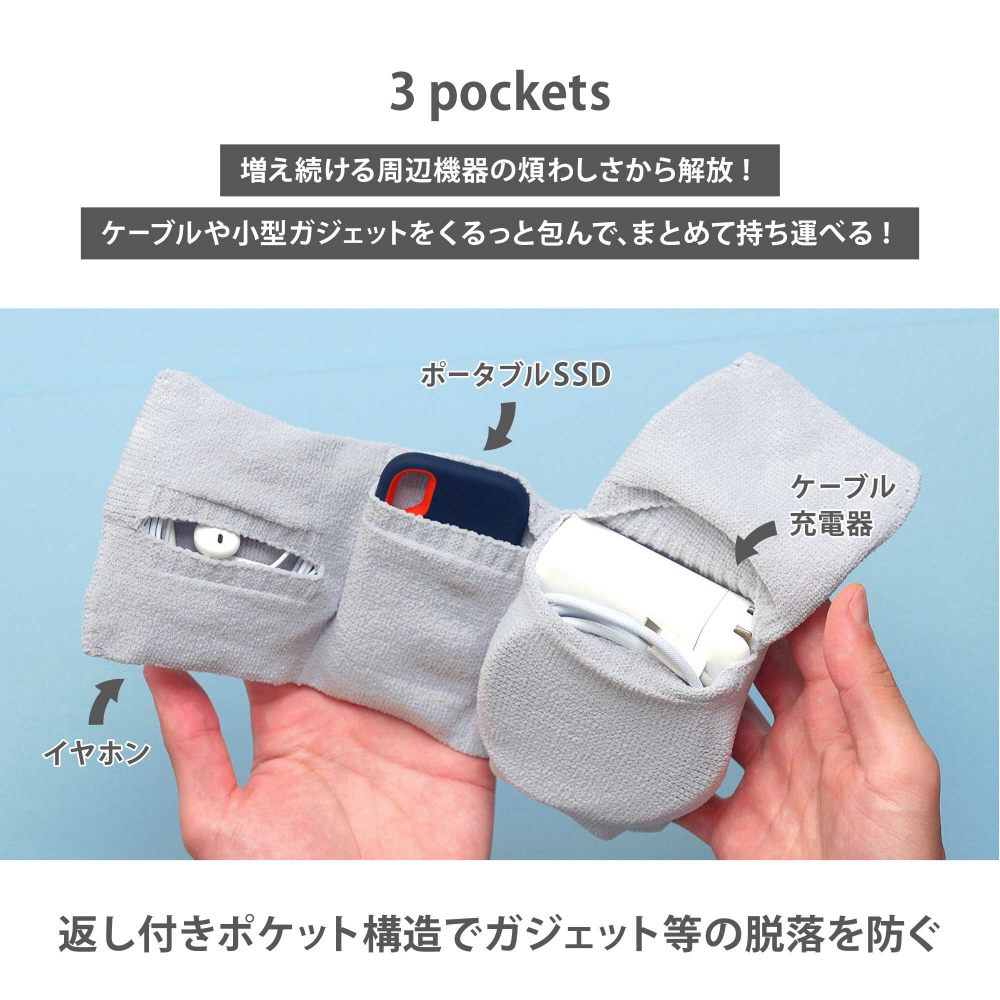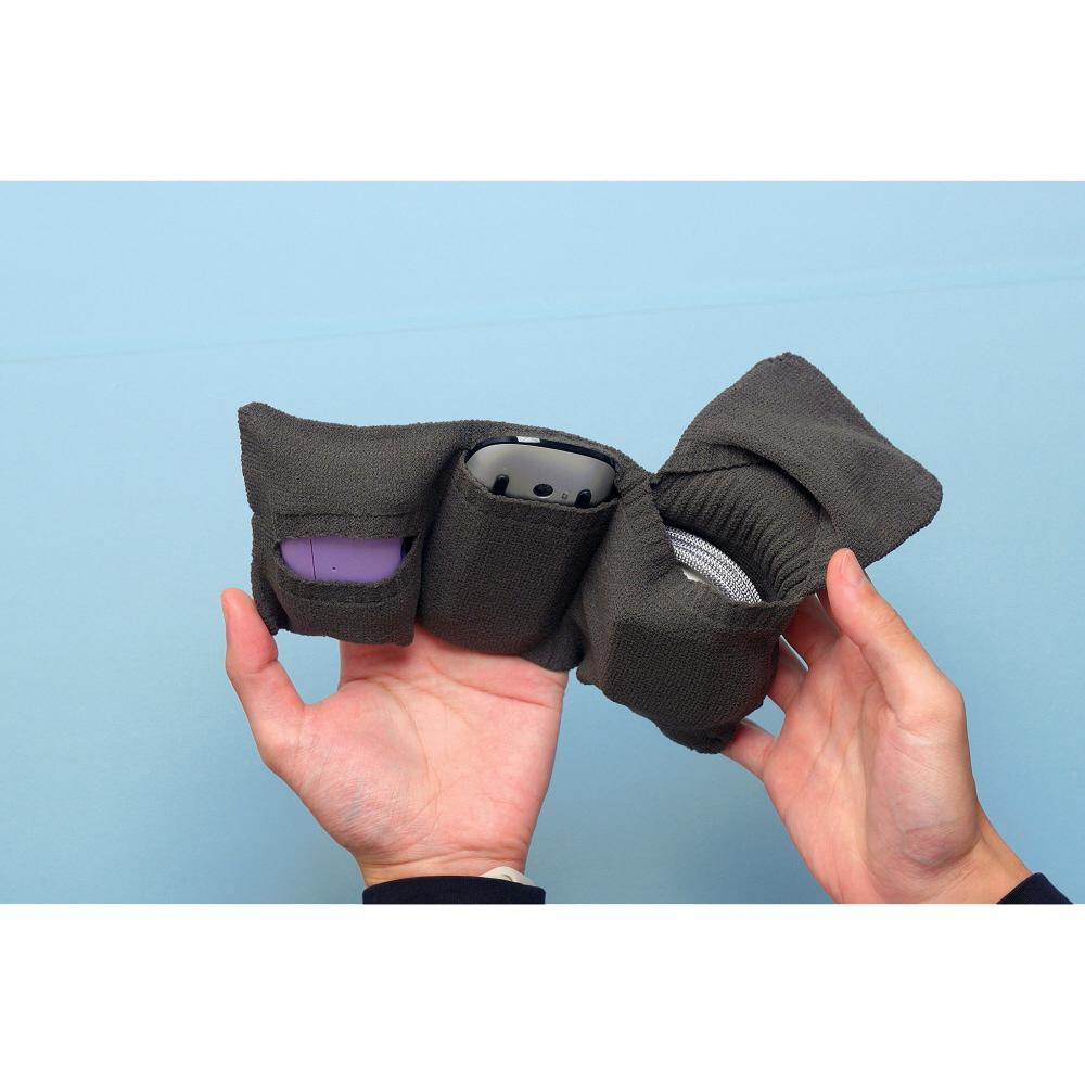ケーブルや小型ガジェットをくるっと包んで、まとめて持ち運べる。