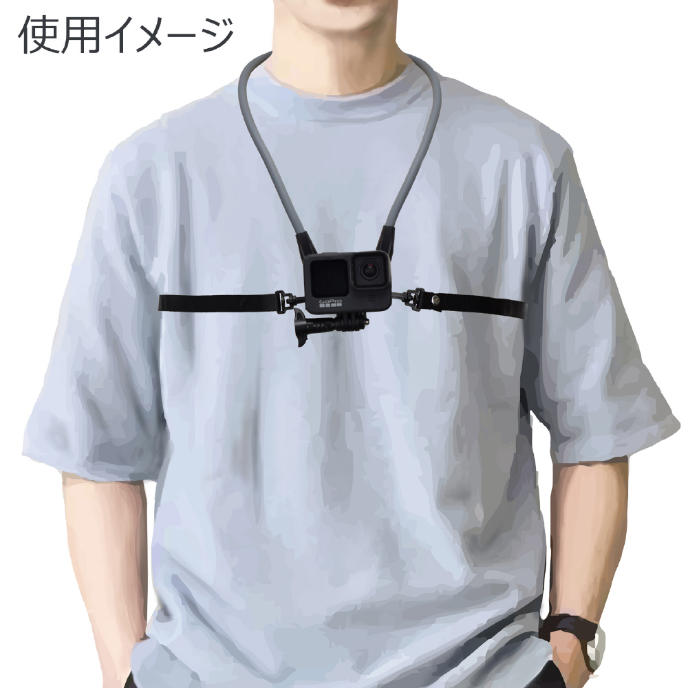 ハンズフリー撮影が可能なネックレスタイプのアクションカメラ対応ホルダー。両手が自由に使えるため、自分の視点から臨場感ある映像を撮影できます。安定性を高めるための取り外し可能なチェストストラップ付き。