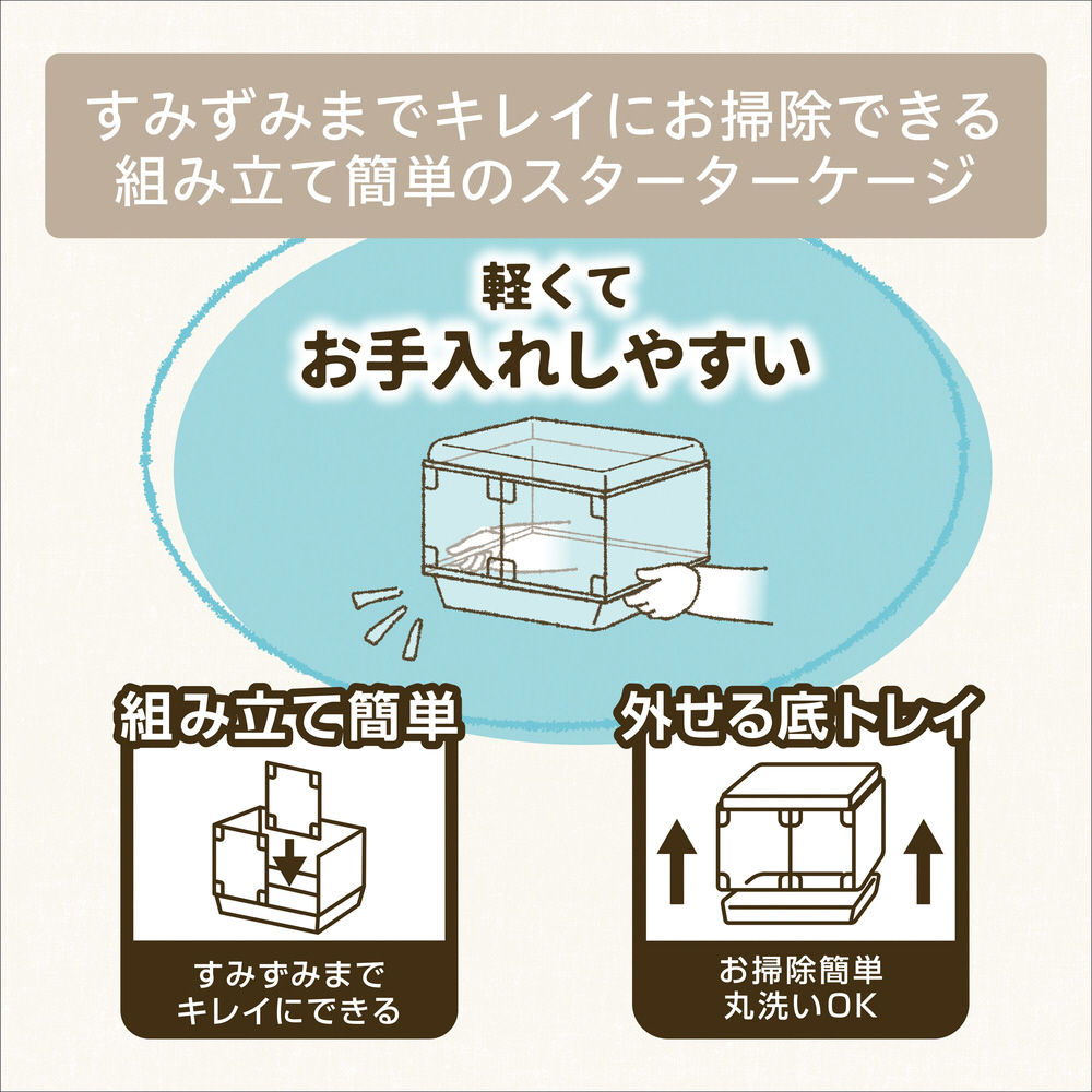 すみずみまでキレイにお掃除できる、組み立て簡単なスターターセット。中の様子がよく見えて、正面からお世話ができるのでペットとの距離がもっと近く感じられます。