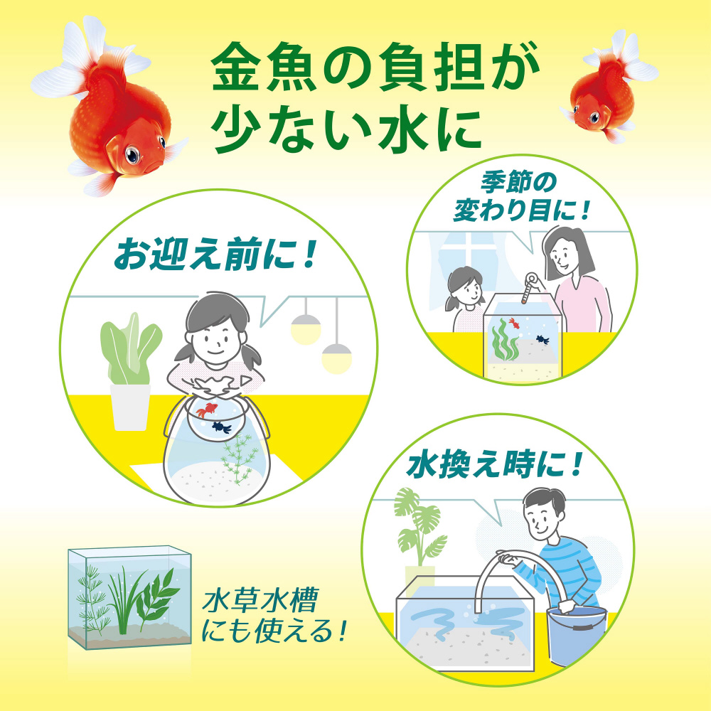 ・金魚のお迎え時や季節の変わり目、水換えの時などに。金魚の負担が少ない水です。