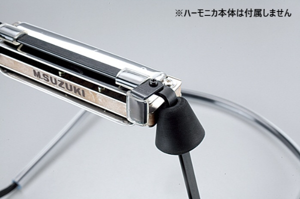 ・サイドのゴムで固定できるためハーモニカを深く咥えることができ、しっかりとした太い音で演奏することができます。さらに、微妙な角度調整も可能です。