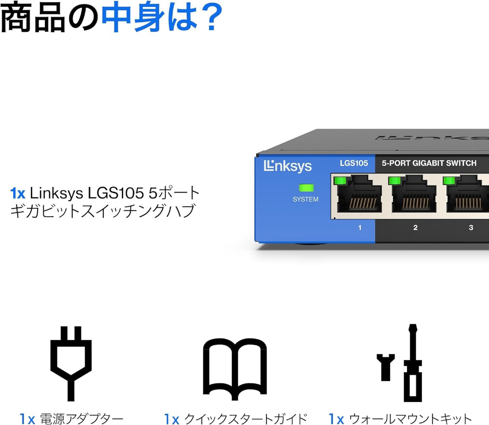 付属品 クイックインストールガイド、電源アダプター、壁掛け用取り付けキット