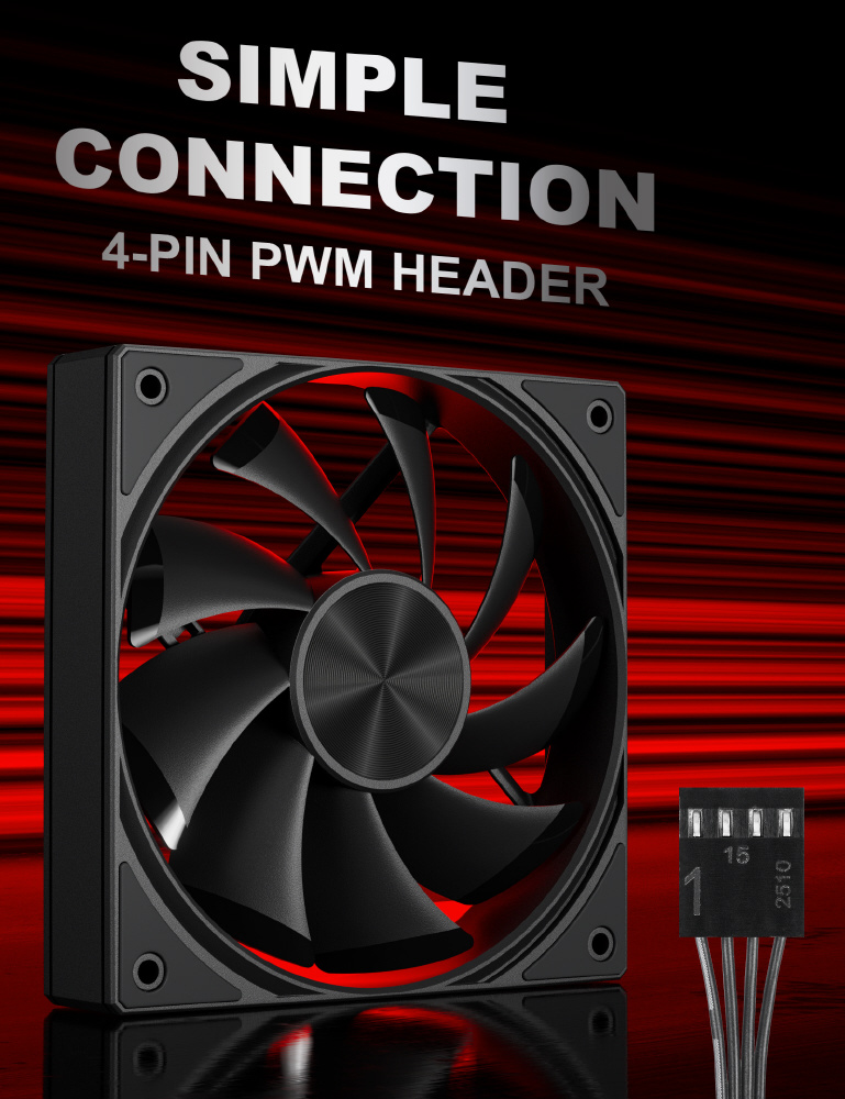 マザーボードの4pinコネクタに接続することで、システムの温度状況に合わせた回転数制御に対応します。