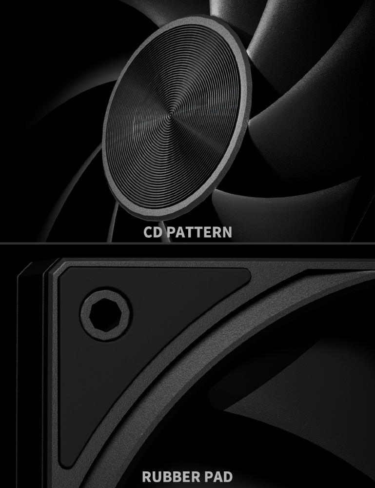 ファンの側面に防振パッドを搭載し、共振やファンの騒音を低減します。