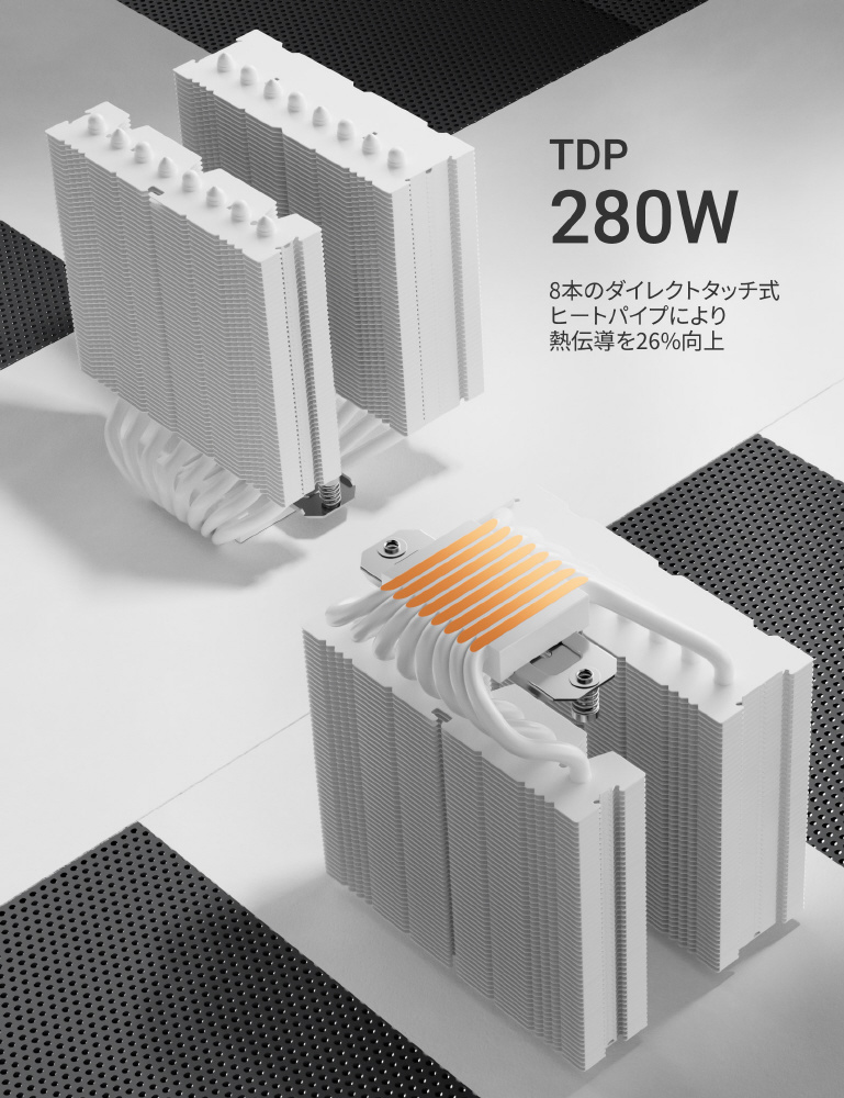 純銅製ダイレクトタッチ式ヒートパイプを8本搭載し、CPUの熱を効率的に吸収しすることで優れた冷却性能を発揮します。高負荷時でもCPUを安定させ、パフォーマンスを最大限に引き出します。