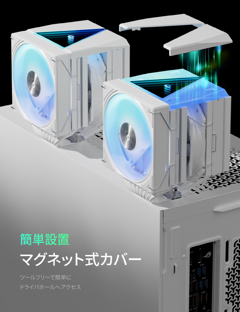 マグネット式のカバーを取り外すだけでヒートシンク上部から直接ドライバーを通すことができ、ファンを取り外すことなく、バックプレートを固定するネジ穴にアクセス可能です。システムの組立時やメンテナンスの際にも手軽に作業することができます。