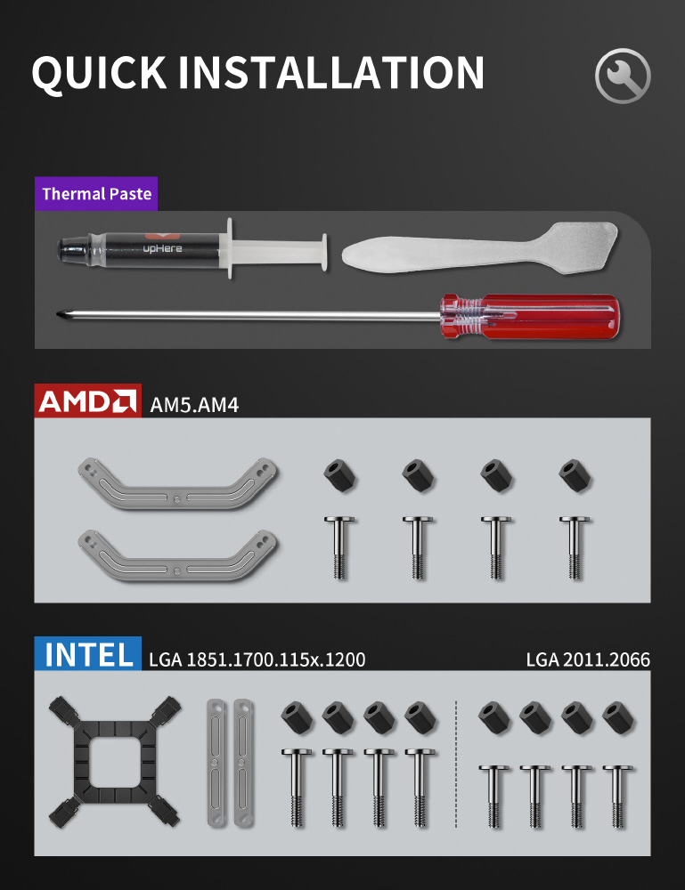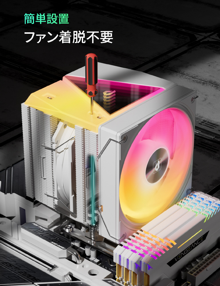 upHere UE2 Elite ARGBは、ヒートシンクからヒートパイプ、ファンまで統一されたカラーリングが特徴的なARGBデュアルファン搭載サイドフロー型CPUクーラーです。純銅製ダイレクトタッチ式ヒートパイプを8本搭載し、優れた冷却能力を発揮します。アシンメトリー設計のヒートシンクによりメモリとの干渉を回避でき、ファンの着脱無しでバックプレートを固定できます。
