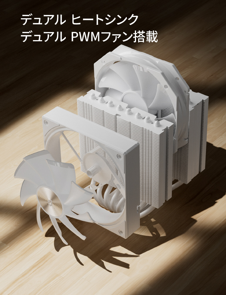 ARGBに対応し、冷却力と静音性を両立した高性能PWMファンを2つ搭載しています。カラーリングはヒートシンクと統一され、一体感のあるデザインです。