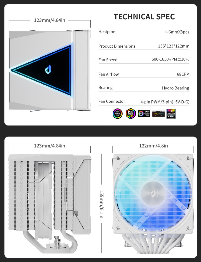 upHere UE2 Elite ARGBは、ヒートシンクからヒートパイプ、ファンまで統一されたカラーリングが特徴的なARGBデュアルファン搭載サイドフロー型CPUクーラーです。純銅製ダイレクトタッチ式ヒートパイプを8本搭載し、優れた冷却能力を発揮します。アシンメトリー設計のヒートシンクによりメモリとの干渉を回避できるだけでなく、ファンの着脱無しでバックプレートを固定でき、取り付けが簡単です。静音性と冷却力を両立したPWMファンを2つ搭載し、ブラックとホワイトの2色をラインアップ。