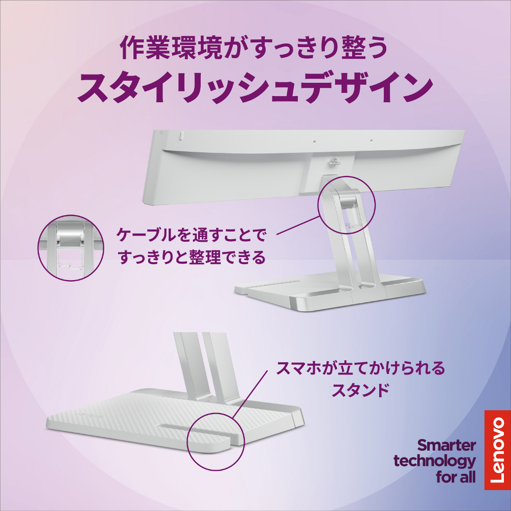 4辺の薄型ベゼルによる洗練されたデザインで、最新のワークスペースにも自然に調和します。さらに、スタンド部分にはスマートフォンを立てかけられる切り込みがあり、デスク上の利便性と整理整頓をサポートします。
