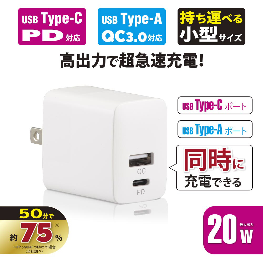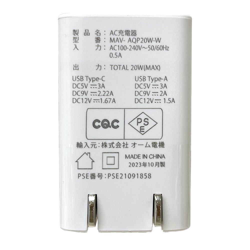 AudioComm AC充電器 PD対応Type-C+QC対応Type-A AudioComm ホワイト MAV-AQP20W-W [2ポート /USB Power Delivery対応]