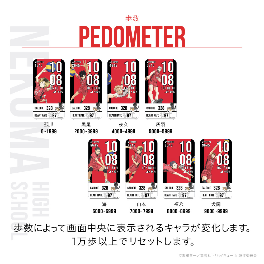 歩数に応じて、文字盤上に音駒高校のメンバーが順番に登場します。