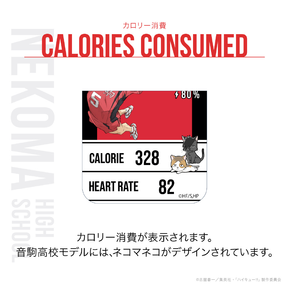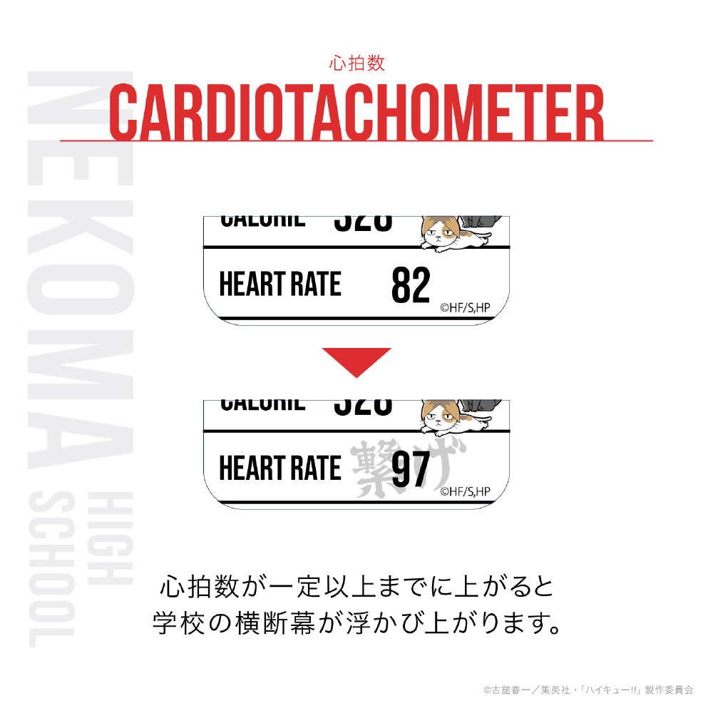 また、心拍数が一定以上になると横断幕「繋げ」の文字が浮かび上がり、通知が届くとネコのシルエットが出現するなど、毎日「ハイキュー!!」の世界を体感できます。