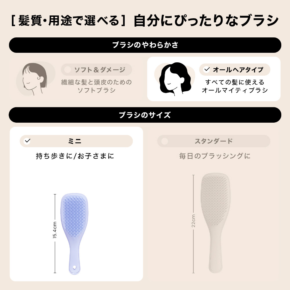 ■いつでもどこでも、気軽にヘアケア髪の絡まりを瞬時に解きほぐすヘアケアブラシ「ザ・アルティメットディタングラー」のミニサイズ。小さなサイズで、気軽にヘアケアを楽しめます。フック穴が付いているので、どこにでも掛けられ、場所を取らずに収納できます。インバス、アウトバスどちらにも使用でき、毎日のブラッシングに最適。髪に無理な力をかけることなく、毛先までやさしく解きほぐします。